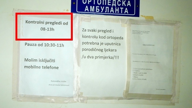 Na vratima piše da se na kontrolne preglede prima do 13.00 časova?! Sačekao sam i opet za desetak minuta pitao ako me mogu ipak primiti jer sam iz drugog grada te da nisam znao šta piše na vratima. Ipak, nisam primljen, jer…”piše na vratima”. Budući da sam na internet stranici Dobojske bolnice vidio šta piše, kako sam ja mogao iz Modriče vidjeti šta piše na vratima Ortopedije u Doboju? Izgubio sam nekoliko sati i imao džaba trošak goriva, ali, eto….
