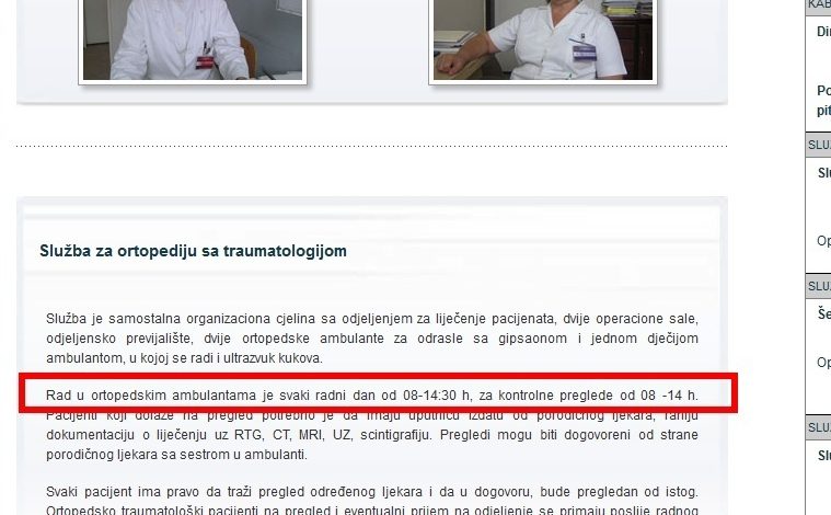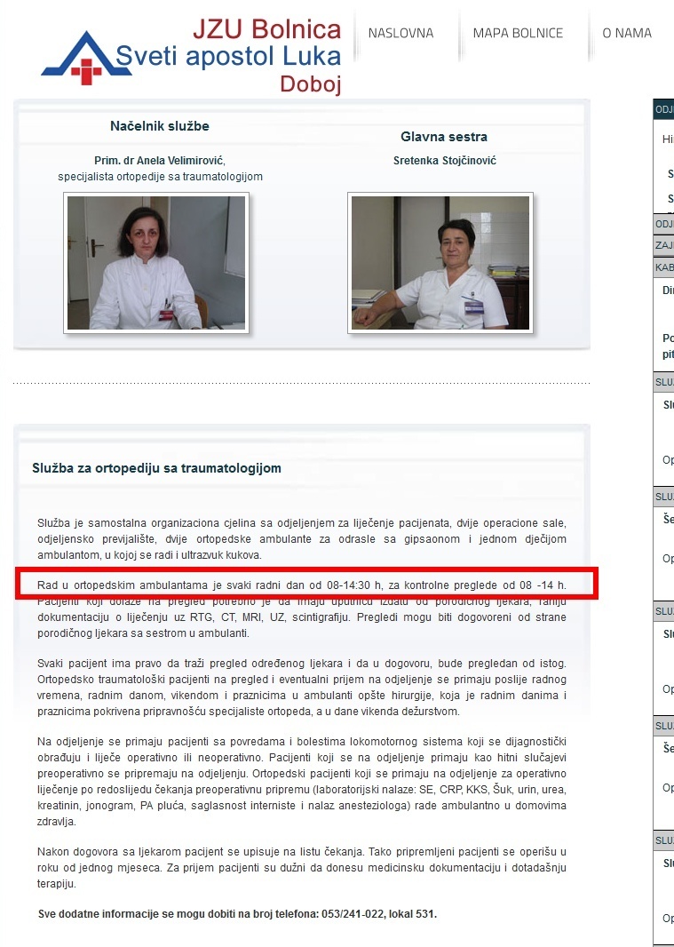 Na internet stranici Bolnice piše da kontrolni pregledi na Ortopediji su od 08.00 do 14.00 časova