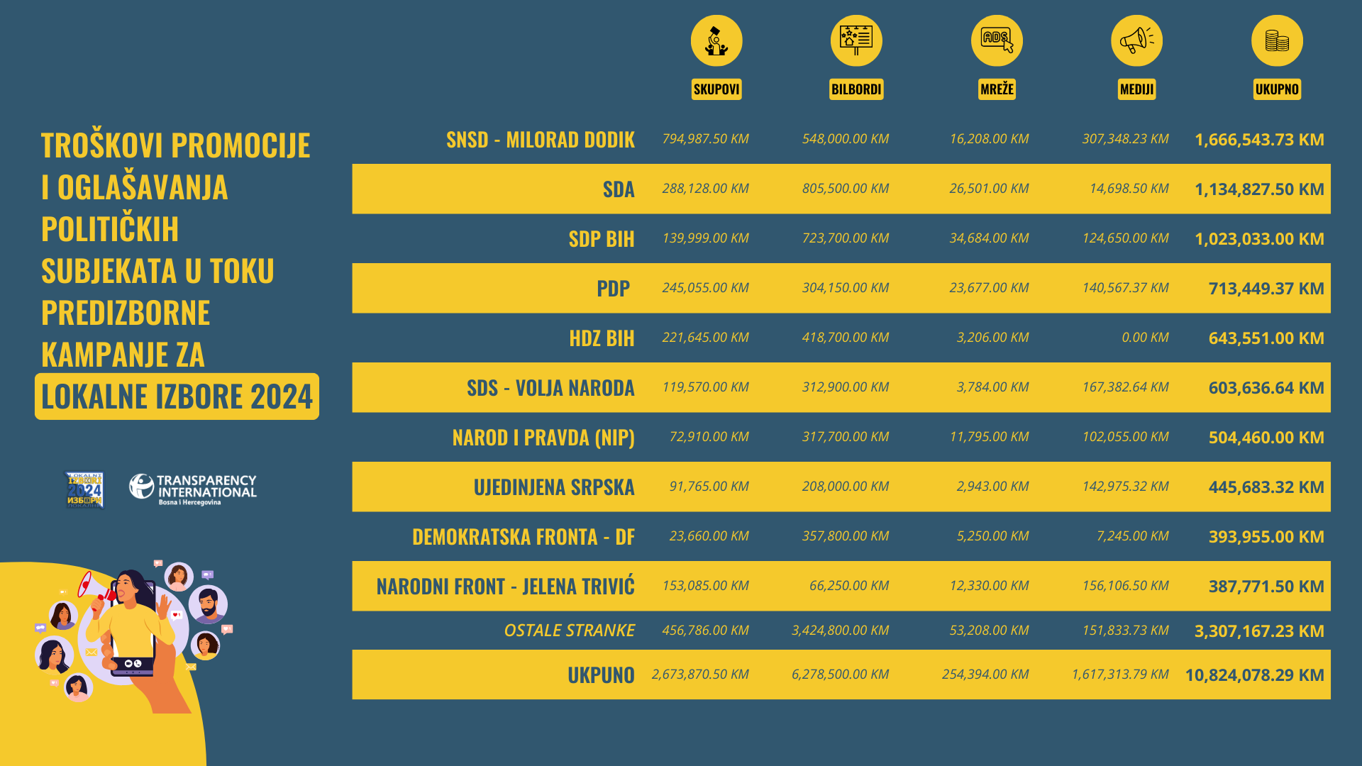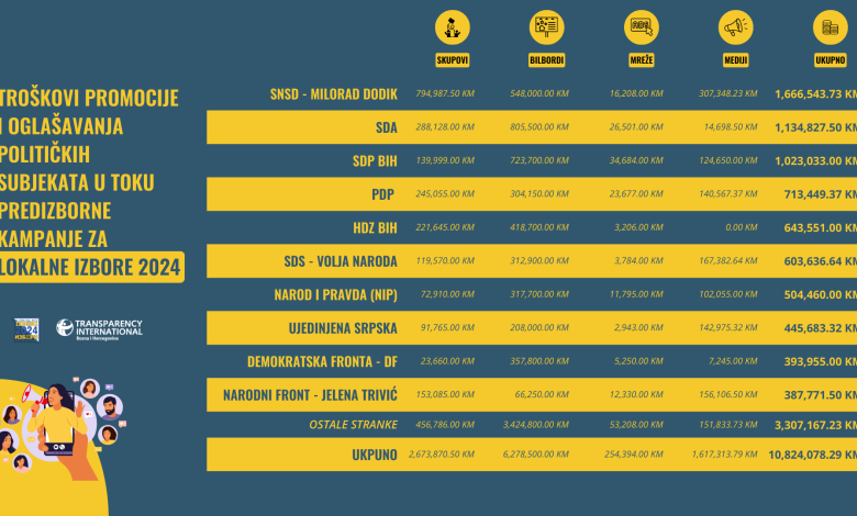 Najveće iznose potrošio je SNSD (1,6 miliona KM), zatim slijede SDA (1,3 miliona KM), SDP BiH (1 milion KM), PDP (713hiljada KM) i HDZ (643 hiljade KM) . Najviše je potrošeno na oglašavanje na bilbordima (oko 6,2 miliona) zatim na predizborne skupove (2,6 miliona) dok vrijednost oglašavanja u najvećim medijima iznosi 1,6 miliona KM.