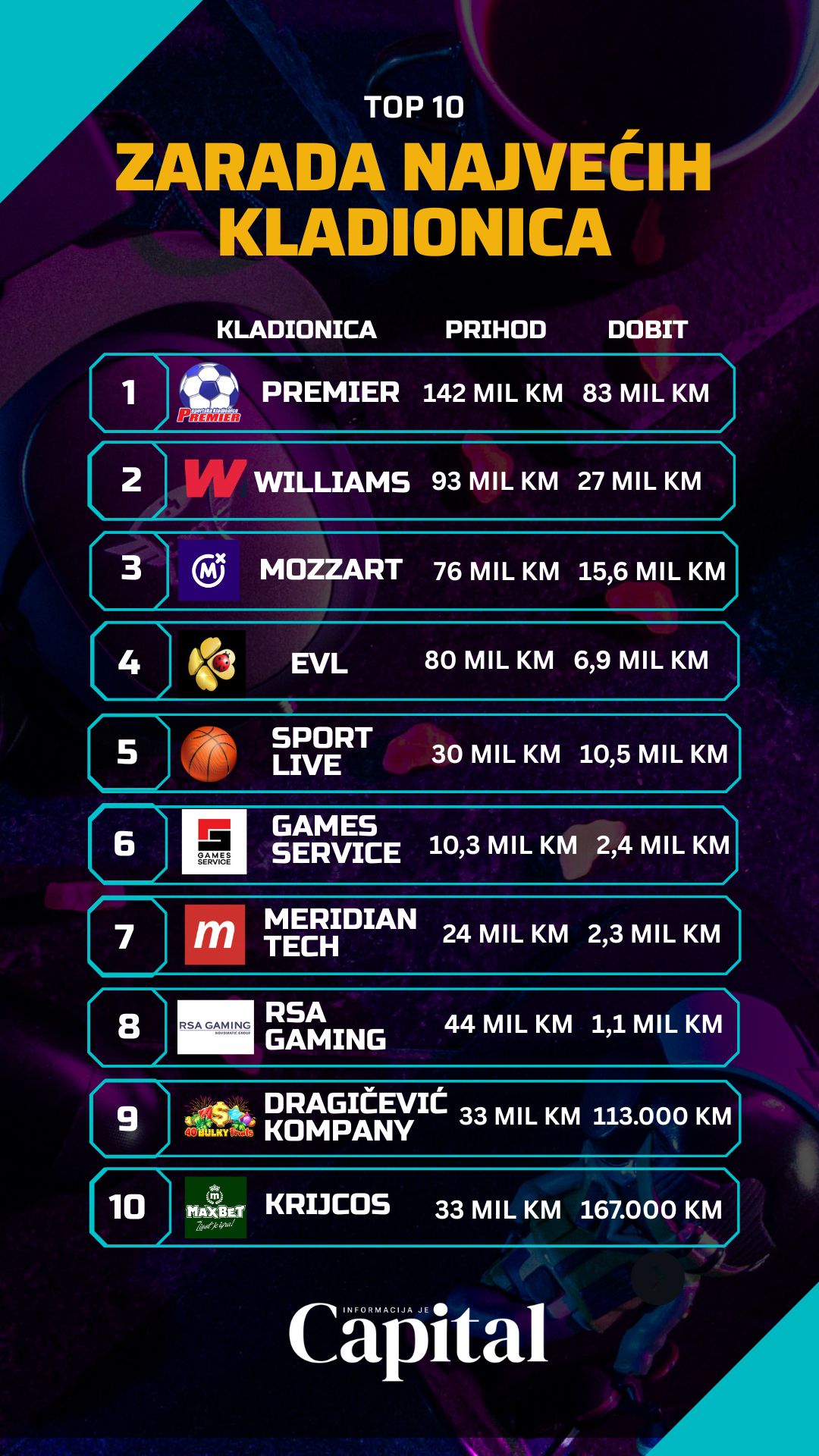 Kladionica „Premier“ sa sjedištem u Istočnom Sarajevu prošle godine je prihodovala više od 142 miliona KM i ostvarila dobit od 83 miliona KM. Istoimena kladionica sa sjedištem u Čitluku iza koje stoji isti vlasnik Renato Korać u Federaciji BiH je prošle godine prihodovala 105 miliona KM i prikazala dobit od 53 miliona KM.