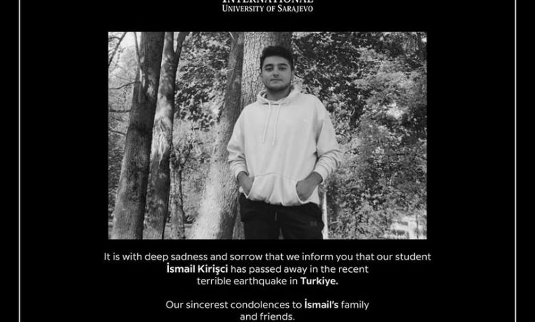 Među hiljadama žrtava poginulih u zemljotresu na jugu Turske nalazi se i Ismail Kirisci, mladić iz truskog grada Hataya, koji je studirao na Internacionalnom univerzitetu u Sarajevu (IUS), javlja Anadolija.