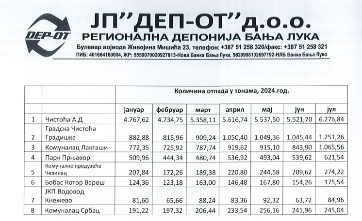 Iz Laktaša je dovezeno 10.217 tona, a iz Prnjavora „samo“ 6.365 tona. Komunalno preduzeće Čelinac dovezlo je 2.578 tona, dok je iz Kotor Varoša dovezeno 1.816. tona. Manje smeća nego iz Čelinca dovezeno je iz opštine Srbac (1.754 tone), iako Srbac ima nekoliko hiljada stanovnika više. Najmanje smeća ili preciznije 888 tona dovezeno je iz Kneževo.