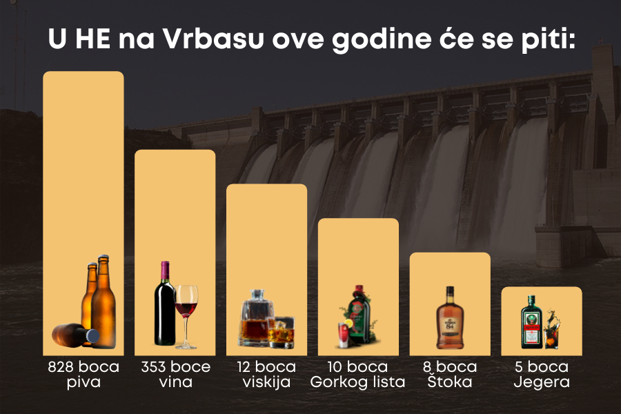 Uprava „Hidroelektrana na Vrbasu“ neće štedjeti na piću ove godine, pa su se tako na spisku „teškom“ 14.000 maraka našle stotine flaša vina i piva različitih proizvođača, a neizostavan je i viski, kojeg, ipak, nabavljaju u nešto manjim količinama.