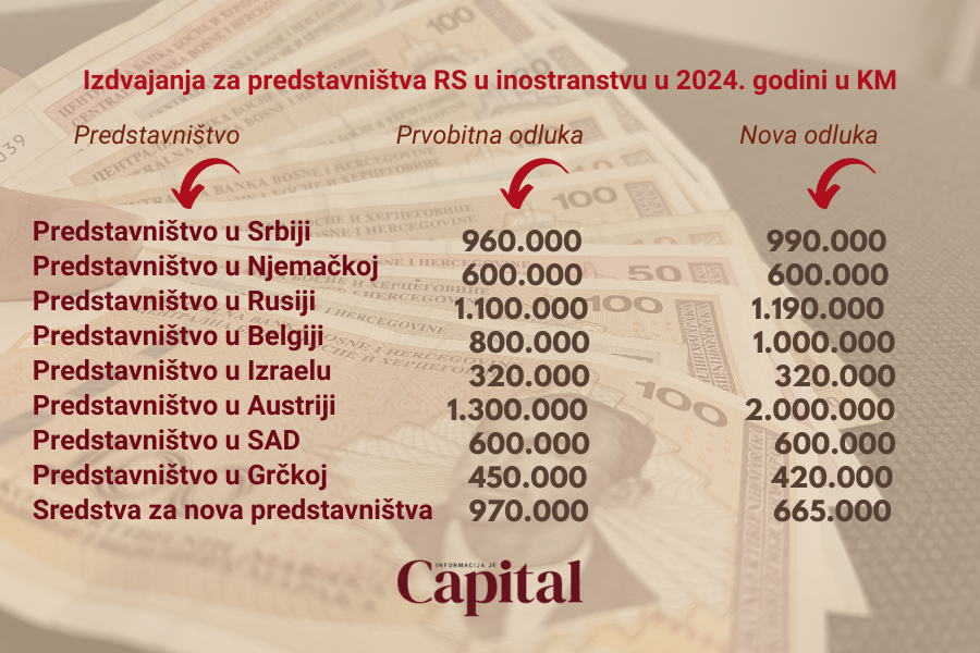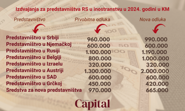 Ostala predstavništva ostaju na prvobitno planiranim iznosima pa će Predstavništvo u Njemačkoj ove godine dobiti 600.000 KM, u Izraelu 320.000 KM, SAD-u 600.000 KM, piše CAPITAL.ba.