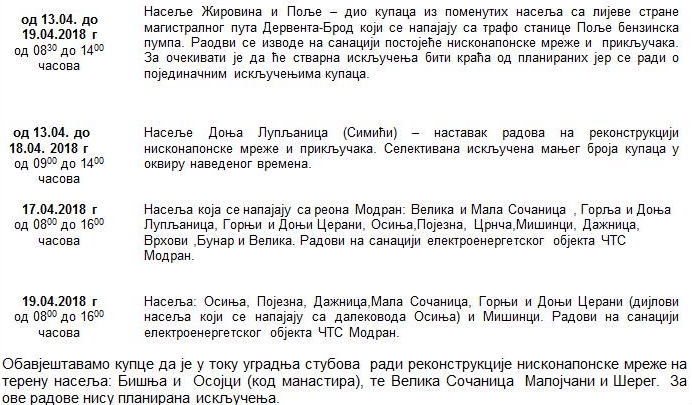 Preduzeće ”Elektro Doboj RJ Derventa” podsjeća svoje kupce o aktuelnim prekidima u isporuci električne energije, te obavještava o narednim prekidima u nekoliko naselja.