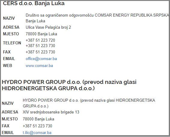 Takođe, kontakti firmi od kojih ERS preuzima koncesiju su isti kao kod „Comsar energy RS“.