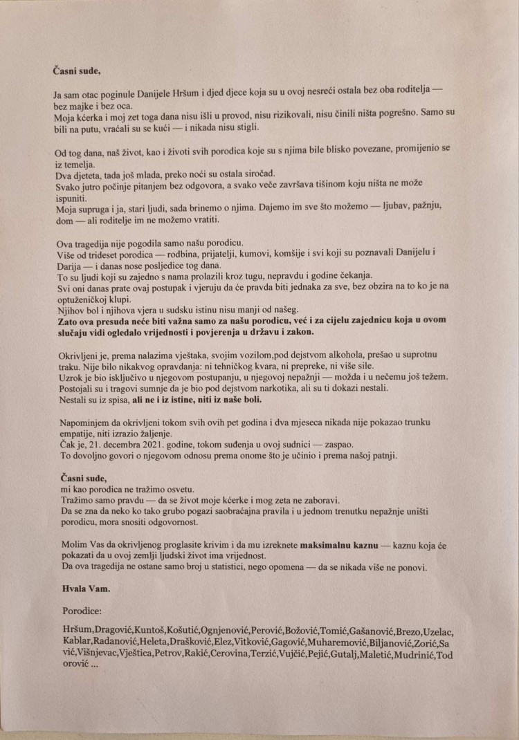 "Časni sude, ja sam otac poginule Danijele Hršum i djed djece koja su u ovoj nesreći ostala bez oba roditelja – bez majke i bez oca. Moja kćerka i moj zet toga dana nisu išli u provod, nisu rizikovali, nisu činili ništa pogrešno. Samo su bili na putu, vraćali su se kući – i nikada nisu stigli. Od tog dana, naš život, kao i životi svih porodica koje su s njima bile blisko povezane, promijenio se iz temelja. Dva djeteta, tada još mlada, preko noći su ostala siročad. Svako jutro počinje pitanjem bez odgovora, a svako veče završava tišinom koju ništa ne može ispuniti", naveo je Dragović.