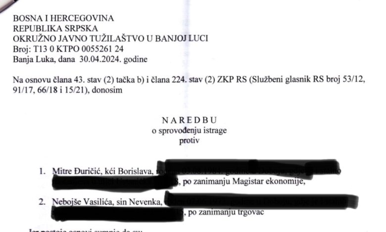 „Nebojša Vasilić i Mitra Đuričić sumnjiče se da su na prevaran način ishodovali presudu Osnovnog suda u Doboju od 27. januara 2022. godine kojom je „Win Build“ obavezan da Nebojši Vasiliću isplati 532.248 KM po osnovu navodne pozajmice koju je on dao svojoj firmi. Na osnovu te presude Osnovnog suda u Doboju, Vasilić i Đuričićeva su 17. oktobra 2022. godine podnijeli prijedlog za izvršenje Osnovnom sudu Banjaluka radi naplate potraživanja Nebojše Vasilića zabilježbom, procjenom i prodajom stanova u vlasništvu „Win Builda“, iako se radi o stanovima nad kojima je Okružni privredni sud odredio mjeru obezbjeđenja u korist „Mobi montinga“, navodi se u naredbi banjalučkog tužilaštva.